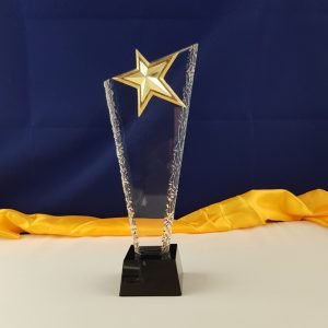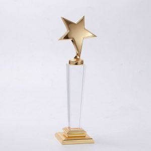 Cúp pha lê đế kim loại thân trụ vuông gắn sao vàng Chất liệu: pha lê, kim loại Công nghệ: in khắc nội dung theo yêu cầu Sản phẩm đựng trong hộp xi lót lụa Giao hàng toàn...