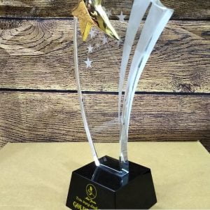 Cúp pha lê thân cong gắn sao vàng Chất liệu: pha lê, kim loại Công nghệ: in khắc nội dung theo yêu cầu Sản phẩm đựng trong hộp xi lót lụa Giao hàng toàn quốc