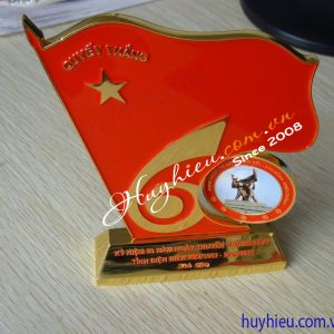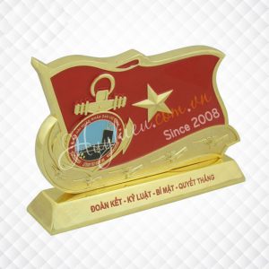 Kỷ niệm chương đồng hình lá cờ Chất liệu: Hợp kim đồng mạ vàng Công nghệ: ăn mòn, đúc nổi logo và chữ Mỗi sản phẩm đựng trong 1 hộp xi lót lụa