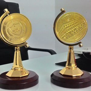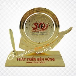 Kỷ niệm chương đồng xoay đế gỗ Chất liệu: Hợp kim đồng mạ vàng, gỗ Công nghệ: ăn mòn, đúc nổi logo và chữ Mỗi sản phẩm đựng trong 1 hộp xi lót lụa