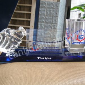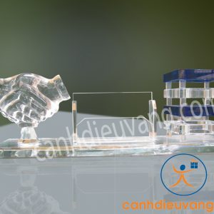 Bộ để bàn pha lê bắt tay cắm bút vuông Công nghệ: in khắc nội dung theo yêu cầu