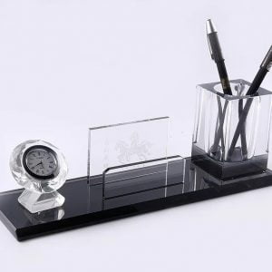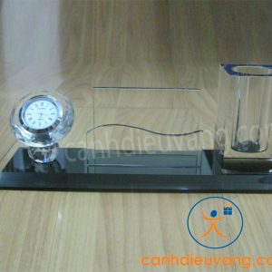 Bộ để bàn pha lê để card ống cắm bút, đế đen có đồng hồ Công nghệ: in khắc nội dung theo yêu cầu
